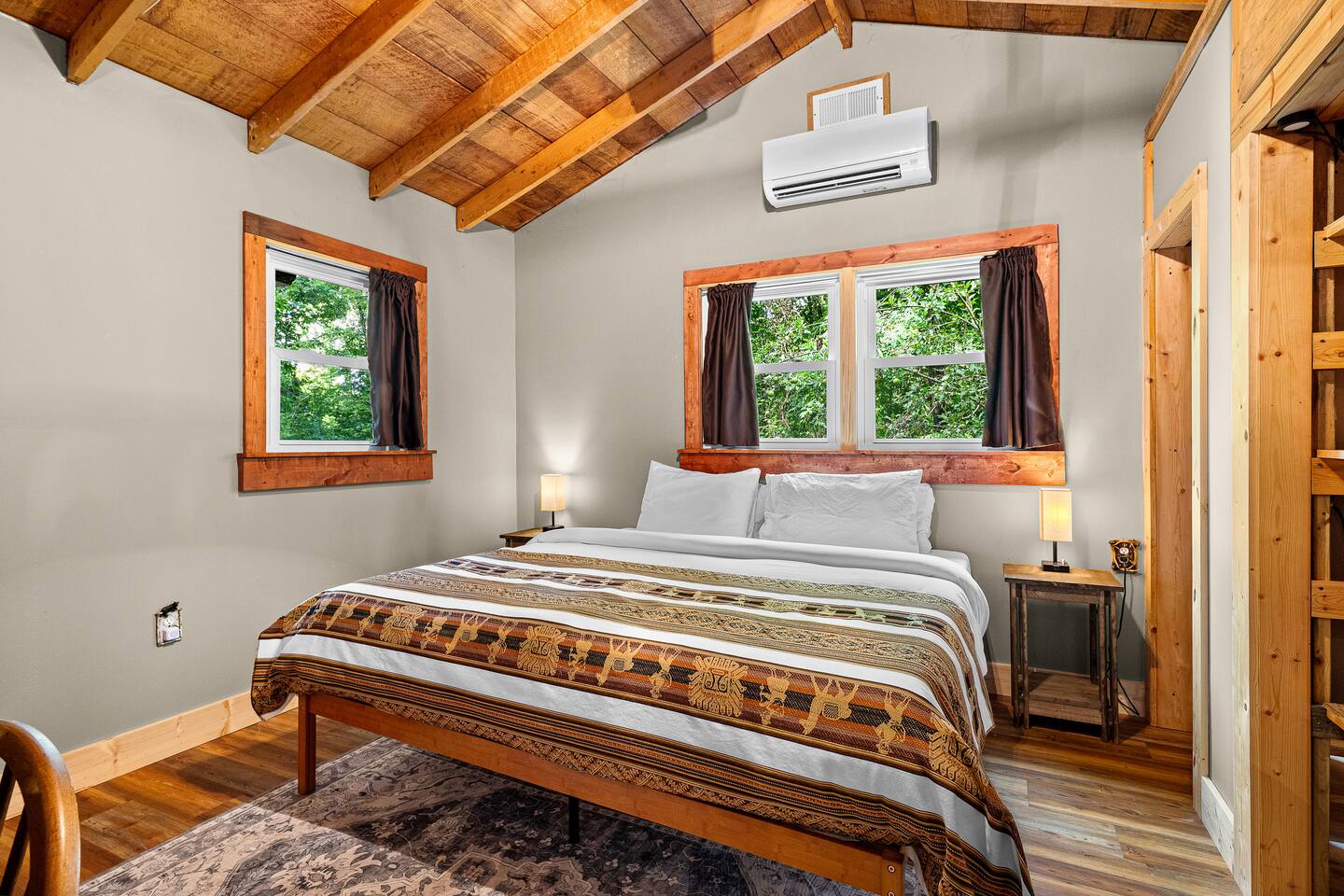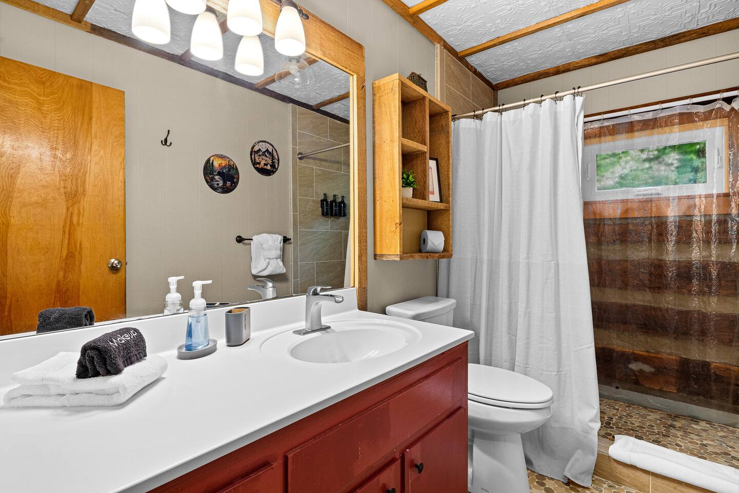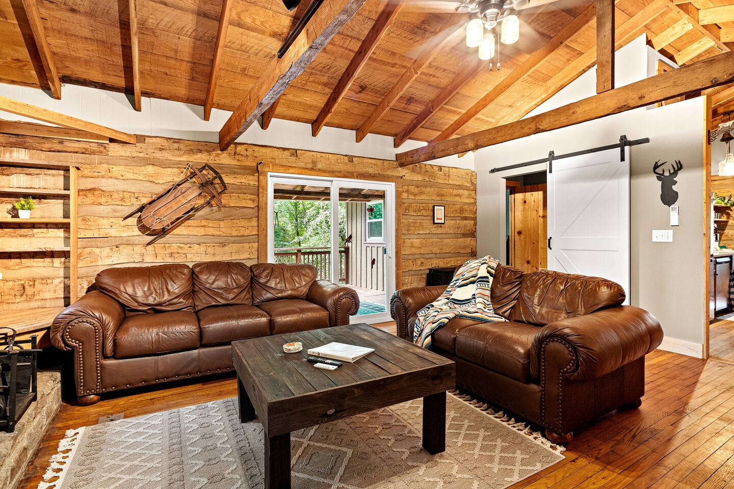 **CONFIRMATION: Your booking is for the ENTIRE 2-FLOOR CABIN! ** This listing includes both the Upper and Lower private suites. The internal stair door will be unlocked, giving your group exclusive access to all 3 bedrooms, 2 full bathrooms, covered and uncovered decks, and the Full Kitchen + Kitchenette. (We also offer separate listings for the individual floors, which may appear in searches.) 🛏️ Sleeping Comfort • Bedroom 1: 1 King Bed • Bedroom 2: 1 Queen Bed • Bedroom 3: 1 Twin Bunk Bed • Extra: 1 Full-Size Futon (Living Room 2) • For Infants: Pack & Play available 👶 (bring own sheets) 🌳 Outdoor Living & Views • Upper Deck: Covered with rocking chairs • Lower Deck: Outdoor dining area • Cooking: Charcoal Grill 🔥 (charcoal not provided) • Fire Pit is available (wood not provided) • Yard: Private yard space with beautiful mountain views • Fun: Cornhole set 🛋️ Indoor Features & Entertainment • Work Zones: 3 dedicated desks/work areas 💻 • Cozy: Board games provided • Dining: Dining table setup with high chair, booster seat, and kids' dinnerware Note: Fireplace is decorative only (do not use) ❌ 🍳 Kitchen Essentials • Appliances: Refrigerator, Dishwasher, Gas Stove, Oven • Small Appliances: Drip Coffee Maker, Microwave, Blender, Toaster • Stocked: Cooking basics, dishes/flatware, and complimentary filtered water ✅ General & Logistics • Climate: Multi-zone A/C & Heating (Ductless) • Laundry: Washer/Dryer with complimentary pods • Tech: Blazing fast 1,000 Mbps WiFi 🚀 & Keyless Entry • Supplies: Linens, towels, and complimentary toiletries