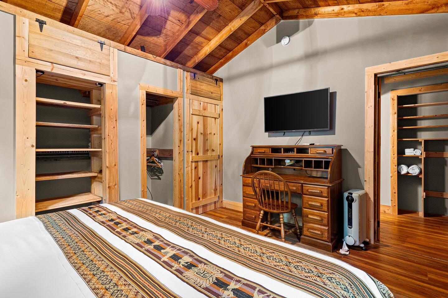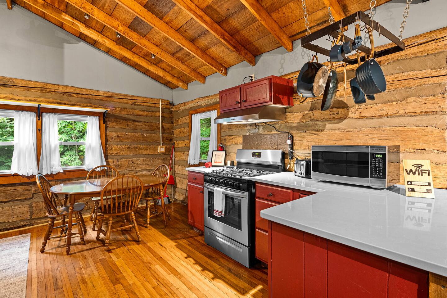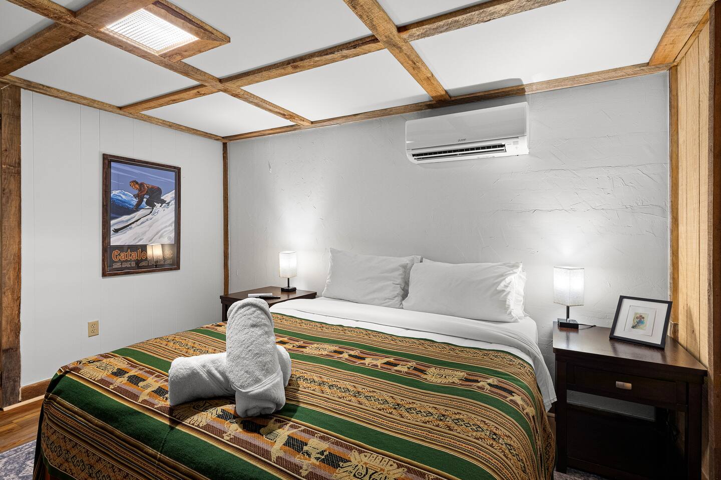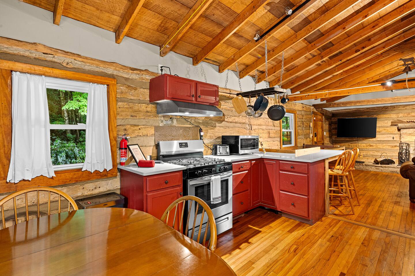 **CONFIRMATION: Your booking is for the ENTIRE 2-FLOOR CABIN! ** This listing includes both the Upper and Lower private suites. The internal stair door will be unlocked, giving your group exclusive access to all 3 bedrooms, 2 full bathrooms, covered and uncovered decks, and the Full Kitchen + Kitchenette. (We also offer separate listings for the individual floors, which may appear in searches.) 🛏️ Sleeping Comfort • Bedroom 1: 1 King Bed • Bedroom 2: 1 Queen Bed • Bedroom 3: 1 Twin Bunk Bed • Extra: 1 Full-Size Futon (Living Room 2) • For Infants: Pack & Play available 👶 (bring own sheets) 🌳 Outdoor Living & Views • Upper Deck: Covered with rocking chairs • Lower Deck: Outdoor dining area • Cooking: Charcoal Grill 🔥 (charcoal not provided) • Fire Pit is available (wood not provided) • Yard: Private yard space with beautiful mountain views • Fun: Cornhole set 🛋️ Indoor Features & Entertainment • Work Zones: 3 dedicated desks/work areas 💻 • Cozy: Board games provided • Dining: Dining table setup with high chair, booster seat, and kids' dinnerware Note: Fireplace is decorative only (do not use) ❌ 🍳 Kitchen Essentials • Appliances: Refrigerator, Dishwasher, Gas Stove, Oven • Small Appliances: Drip Coffee Maker, Microwave, Blender, Toaster • Stocked: Cooking basics, dishes/flatware, and complimentary filtered water ✅ General & Logistics • Climate: Multi-zone A/C & Heating (Ductless) • Laundry: Washer/Dryer with complimentary pods • Tech: Blazing fast 1,000 Mbps WiFi 🚀 & Keyless Entry • Supplies: Linens, towels, and complimentary toiletries